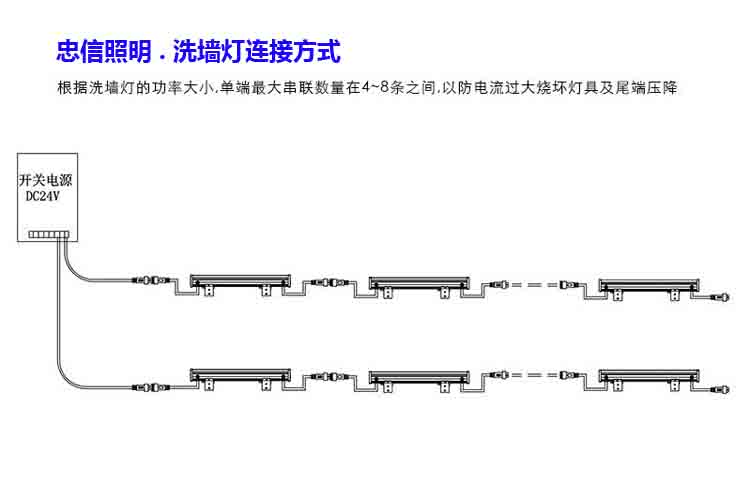 二:將燈具與電源線連接牢固,不用的線頭用防水膠帶包好;在安裝接線時(shí)洗墻燈串聯(lián)數(shù)量保持在5~6條左右,以防串聯(lián)較多時(shí)后端壓降大(詳見下面的示意圖);